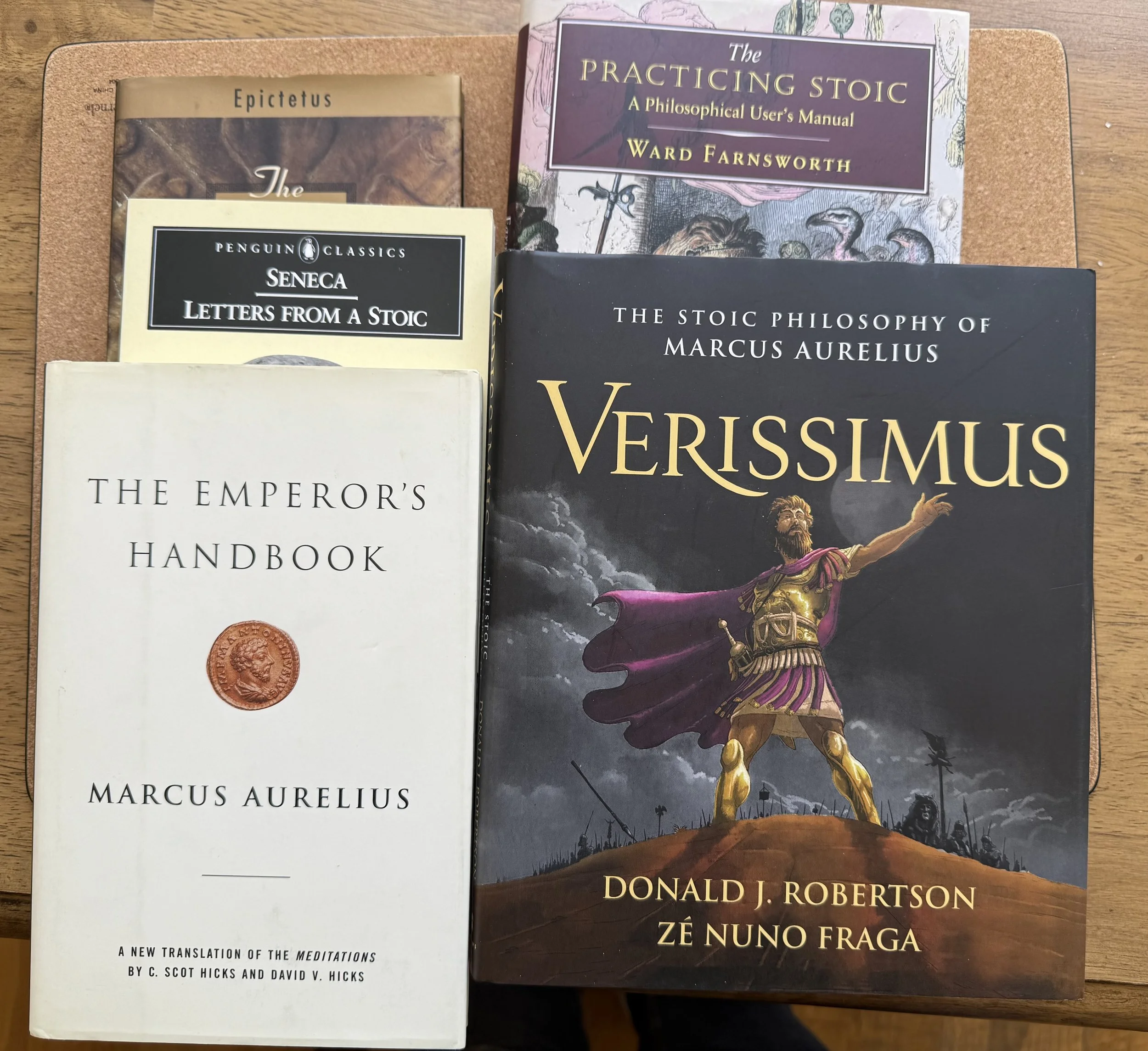 The main readings come to us through Seneca (4 bce-65 ce, rags to riches to suicide after falling out of favor with Nero) and his Letters; Epictetus (55-135 ce) and his work as transcribed by his student Arrian into the wonderfully named Diatribes (discourses) and Enchiridion (handbook); and the fifth of the Five Good Roman Emperors Marcus Aurelius (121-180) (MA) and his Meditations in Greek, mostly jotted during his endless Germanic campaigns. Authors like Cicero, Montaigne and Samuel Johnson selectively restated and refined their observations. Ward Farnsworth’s The Practicing Stoic (2018) is an attractive and well-organized compilation of the most commendable pieces, leaving behind the religion and astronomy and damping down some of the colder advice (his trying to contextualize Epictetus’s advice not to internally grieve over another person’s sorrow comes off as what a lawyer might call special pleading).