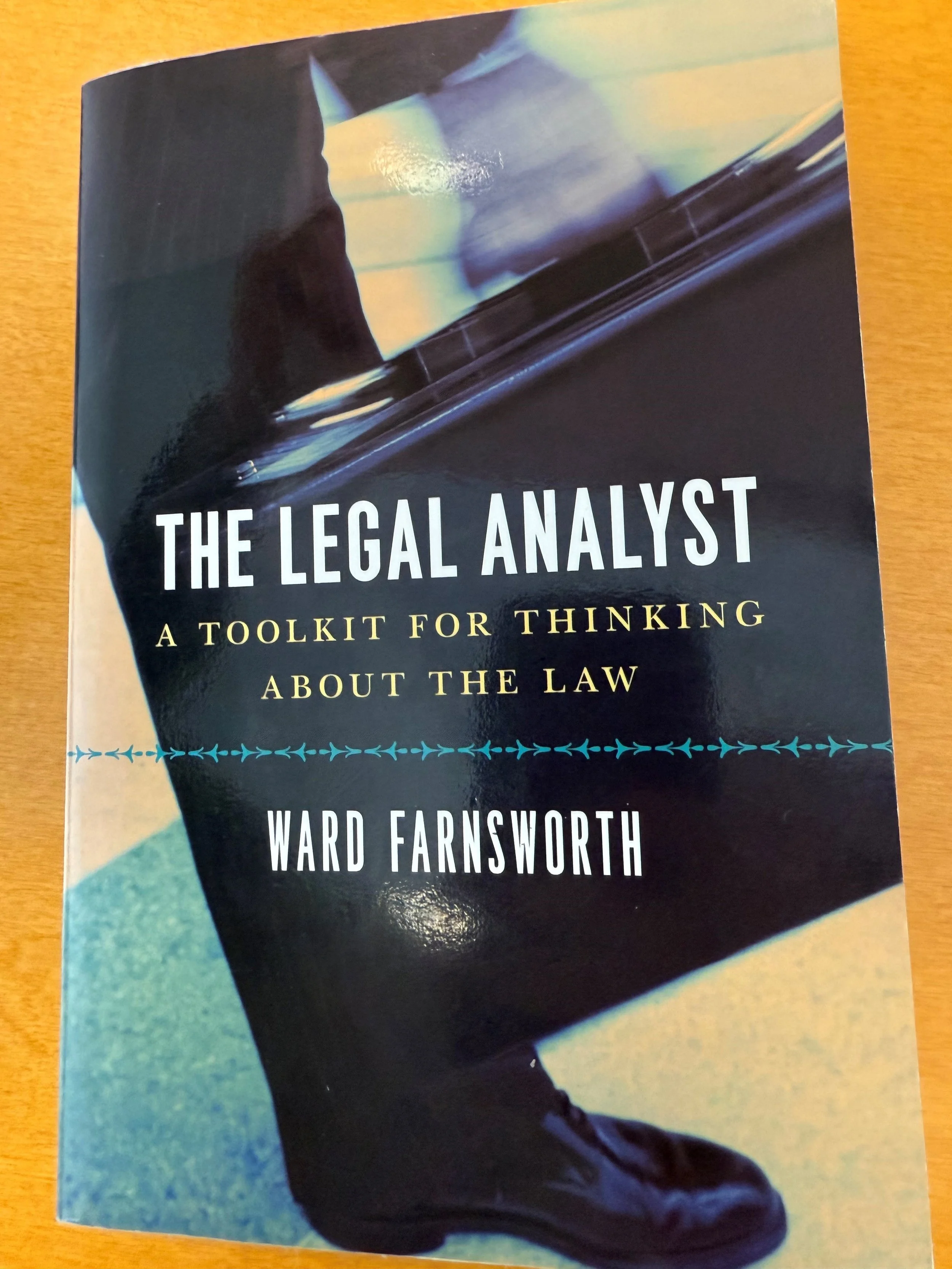 Ward Farnsworth, University of Texas law professor and former dean, wrote a book while at Boston University entitled The Legal Analyst: A Toolkit for Thinking About the Law (2007). It is a rich work that appeals to me, but I find it difficult to navigate. A reason is that the author tends to start each chapter unfolding one or more examples, only later telling the reader what concept is being illustrated. The reader has to re-read the chapter to apply and internalize the concept.